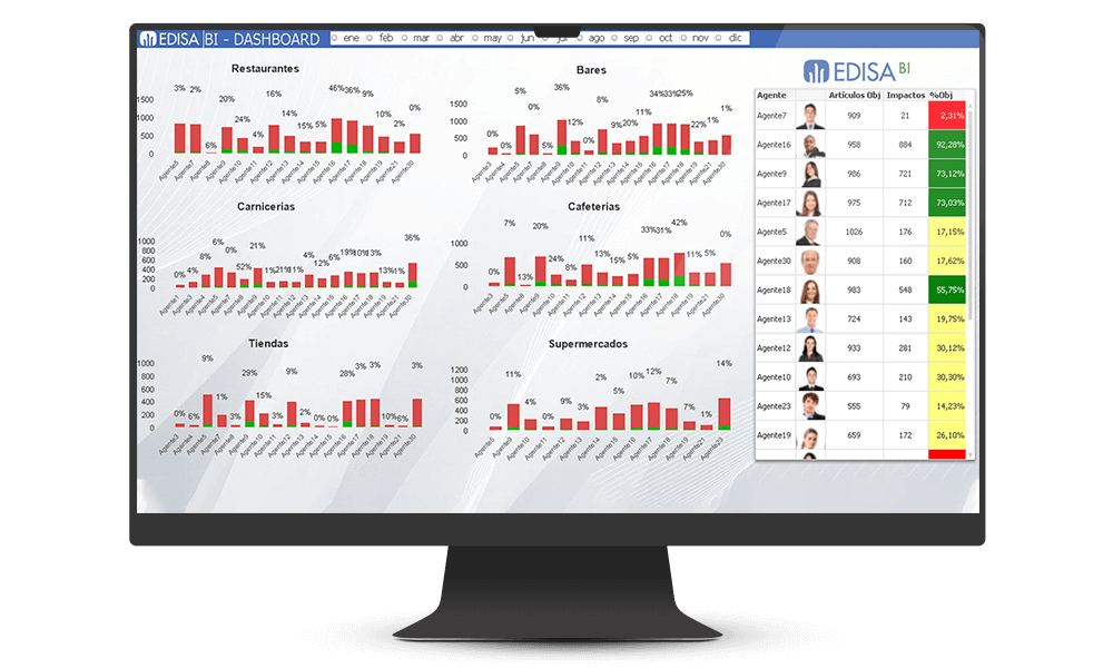 Análisis Comercial de Edisa Business Intelligence facilita la actividad comercial mediante el seguimiento, desde distintas ópticas de la venta y los objetivos comerciales de los agentes.